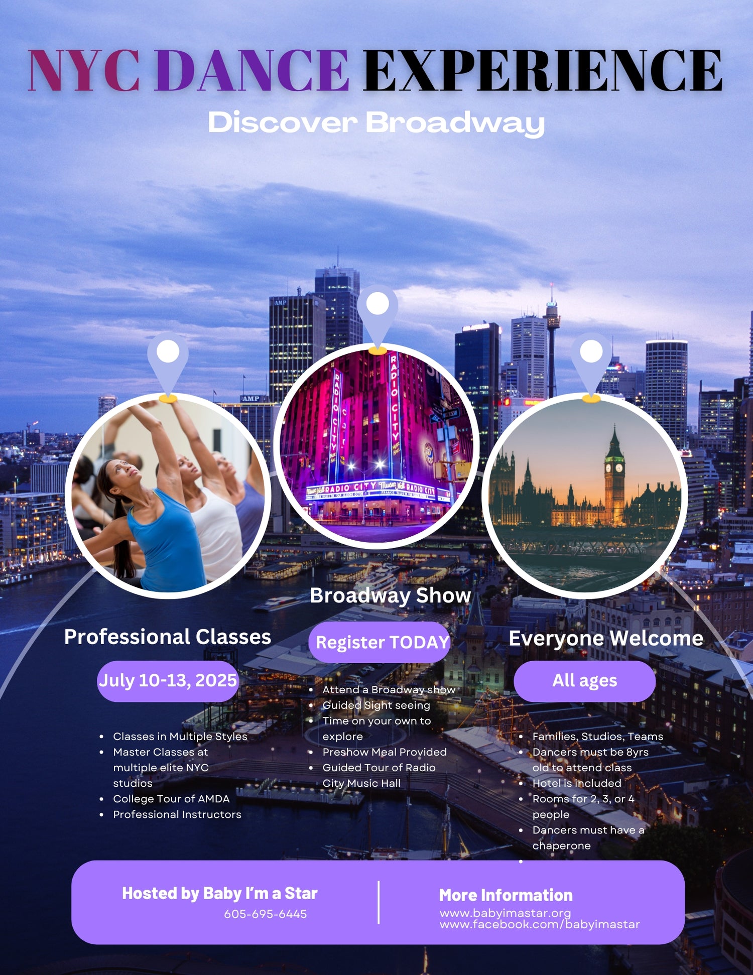Package includes: hotel for 3 nights, 3 breakfasts, Broadway Dinner, Broadway Show, Master Classes, AMDA Tour, Radio City Tour, Subway pass, Many Sight Seeing opportunities.